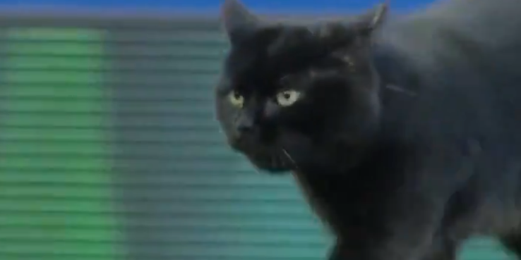 Le beau matou a fait tout le tour du terrain histoire de s’échauffer (et mettre l’ambiance dans les tribunes) avant de faire une sortie triomphale sans qu’aucun membre du staff technique ne puisse l’attraper.